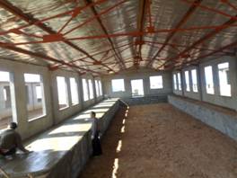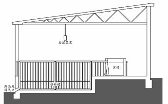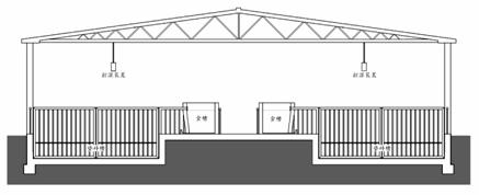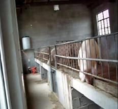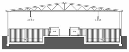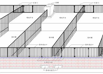 就是将垫料槽建在地面上,垫料槽底部与圈舍外地面持平或略高,硬地平台及操作通道须垫高50-100cm(见图2-2),利用硬地平台的一侧及圈舍外墙构成一个与圈舍等长的长槽,并视养殖需要中间由铁栅栏分隔成若干圈栏,以防止串栏(见图2-3)。